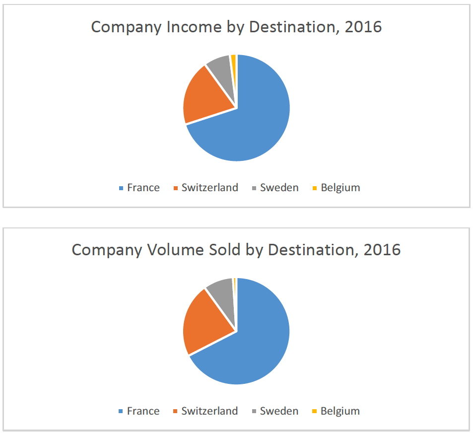 The main export markets were Switzerland (20 percent of total turnover), Belgium (2 percent), and more recently Sweden (8 percent). The wines sold in Switzerland were essentially first wines that were better appreciated there than domestically. Since 2017, Sweden had represented a new market (7,000 bottles had been sold there, a turnover rate of 65,500 Euros). In this country, wines were sold through a state monopoly. In the future, the Swedish market should constitute a recurrent commercial outlet for the estate (Exhibit 6).