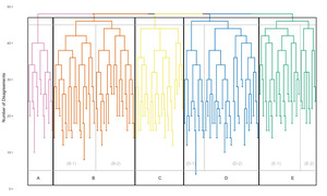 As noted in the Clustering Analysis section, because hierarchical dendrograms are nested, cutting the tree at a lower level produces cluster assignments that are strict subclusters of the original five branches, since the order of merges in the dendrogram is not dependent on a choice of cluster number. The next lowest level for cutting the dendrogram in Figure 1 into more clusters would divide the three largest clusters (B, D, and E) into two clusters each, as indicated by the light gray lines in Figure 1. The three largest clusters (B, E, and D respectively) also have the highest measures of intra-cluster disagreement (D, B, and E respectively). Note that Clusters B, D, and E all divide into two subclusters each at the same point on the dendrogram; none of those larger clusters can be subdivided without also subdividing the other two. Clusters A and C remain intact when cutting the dendrogram at that point.